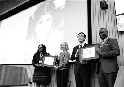 10月16日,在位于法國巴黎的聯(lián)合國教科文組織總部,烏干達(dá)機(jī)構(gòu)“促進(jìn)非洲學(xué)校平等網(wǎng)絡(luò)”的負(fù)責(zé)人(右一)和贊比亞機(jī)構(gòu)“促進(jìn)女性教育行動(dòng)”的代表(左一)出席頒獎(jiǎng)儀式。