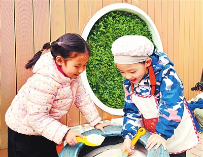 ④孩子們?cè)趹敉饴稜I(yíng),給同伴“做飯”。 本版圖片均由首都師范大學(xué)附屬幼兒園提供