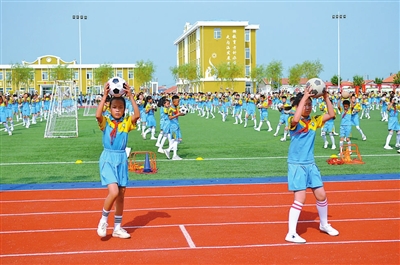 黑龍江省齊齊哈爾市泰來(lái)縣大興鎮(zhèn)中心學(xué)校的學(xué)生們?cè)谧龃笳n間足球操,身后的樓外墻體上醒目地寫(xiě)著“按教育方針辦學(xué),走內(nèi)涵發(fā)展道路”。該校的樓內(nèi)樓外、主要會(huì)議室中都有與教育方針相關(guān)的學(xué)校文化標(biāo)識(shí)。 資料圖片
