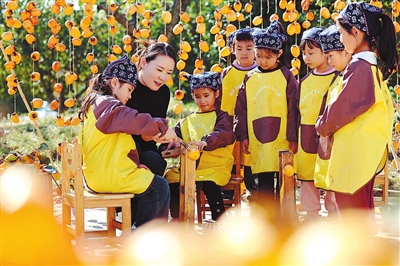 10月23日,在山東省臨沂市沂南縣界湖街道中心幼兒園,小朋友在教師的指導(dǎo)下給柿子削皮。當(dāng)日是二十四節(jié)氣中的霜降,界湖街道中心幼兒園師生來到校園柿子樹下采收、削皮、晾曬,加工柿餅,在勞動(dòng)中感受傳統(tǒng)民俗節(jié)氣的獨(dú)特魅力。 王彥冰 劉艷麗 攝