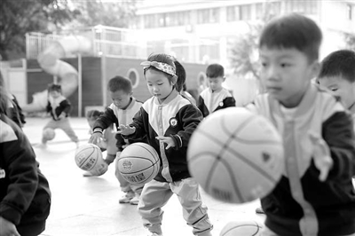 10月23日,在江蘇省淮安市高良澗幼兒園,小朋友們在做趣味籃球操。該園針對幼兒身體成長和興趣,排練趣味籃球操,讓孩子們愛上運(yùn)動。 殷潮 攝