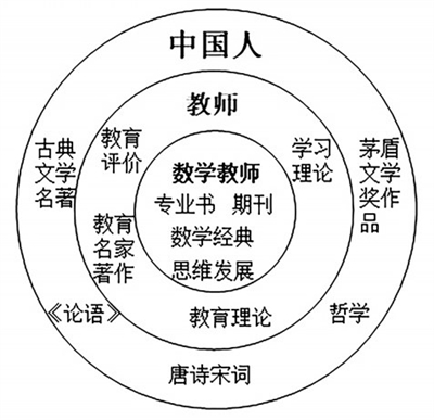 今年,我有幸到許多省份給數(shù)學(xué)教師作講座和交流,交談中,他們讓我推薦幾本“最管用的書”。平時(shí)教師們工作很忙,抽不出太多時(shí)間看書,現(xiàn)在書又太多,經(jīng)常不知道讀哪一本管用。那么,數(shù)學(xué)教師該讀哪些書?結(jié)合讀過(guò)的書,我做了一個(gè)自己的“讀書身份擴(kuò)展圖”(見(jiàn)下圖)。
