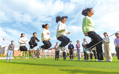 10月28日,江蘇省海安市城南實驗小學(xué)的學(xué)生在課間跳長繩。該校積極開展“陽光體育一小時”活動,通過多樣化的體育項目,增強學(xué)生體質(zhì),提高學(xué)生身體素質(zhì),讓學(xué)生們享受運動的快樂,鍛煉出健康的體魄。