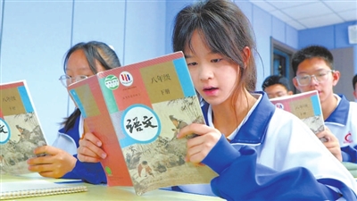 格爾木市第五中學(xué)學(xué)生在課堂上誦讀《在長江源頭各拉丹冬》。 本報記者 梁瑞哲 攝