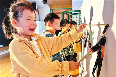 11月14日,在浙江省湖州市長(zhǎng)興縣水木花都幼兒園,孩子們體驗(yàn)非遺皮影戲。長(zhǎng)興縣教育部門(mén)挖掘利用本地鄉(xiāng)土文化資源,組織百葉龍、下箬馬燈、木偶戲等民俗文化和民間技藝進(jìn)校園活動(dòng)近百場(chǎng)。