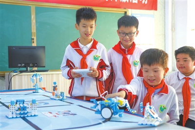 日照市新營小學(xué)學(xué)生在控制機(jī)器人完成文藝表演任務(wù)。 本報(bào)記者 單藝偉 攝