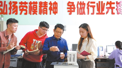 在“河南省總工會(huì)魏建平勞模創(chuàng)新工作室”里,“全國(guó)高校黃大年式教師團(tuán)隊(duì)”帶頭人、河南理工大學(xué)教授魏建平(右二)為學(xué)生們講解煤層注水添加劑的選配以及潤(rùn)濕效果。