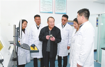 在河南理工大學國家重點實驗室,該校1962級校友、中國工程院院士張鐵崗(左三)指導團隊青年教師及博士生開展受載低滲煤樣裂隙分布及發(fā)育規(guī)律的CT掃描實驗。
