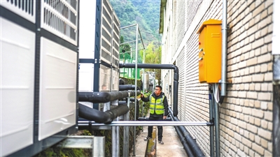 左工作人員在檢查亮巖小學(xué)的供熱設(shè)施(11月21日攝)。