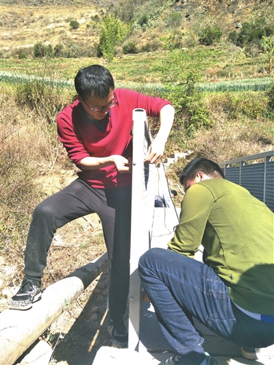 ③河海大學(xué)公益橋團(tuán)隊(duì)學(xué)生常天亮用經(jīng)緯儀現(xiàn)場(chǎng)測(cè)量橋位坐標(biāo)。 學(xué)校供圖