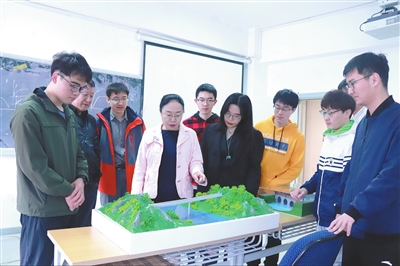 ②楊麗輝與學(xué)生討論橋梁設(shè)計(jì)方案。
