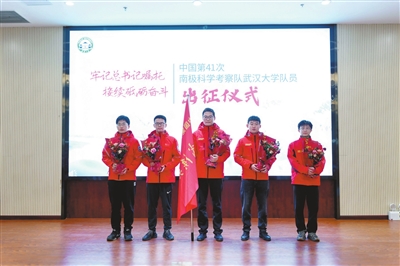 “出征!”“保證完成任務(wù)!”近日,由5名武漢大學(xué)師生組成的科考隊(duì)接過隊(duì)旗,正式出征中國第41次南極科學(xué)考察。本次出征既是武漢大學(xué)參與南極科考覆蓋面最廣的一次,也是武漢大學(xué)師生對(duì)習(xí)近平總書記一年前重要回信的響亮回答。