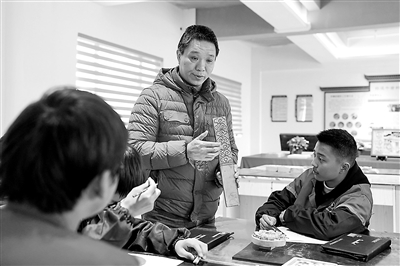 日前,安徽省行知學(xué)校教師方萌樂(中)在磚雕實(shí)訓(xùn)課上向?qū)W生教授磚雕技巧。
