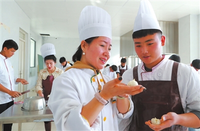 張家口市援疆教師張翠蘭(左)給和碩縣高級中學烹飪專業(yè)學生傳授面點制作方法。