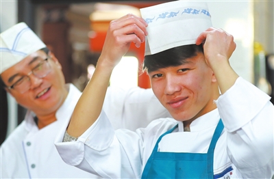 和碩縣高級中學烹飪專業(yè)學生艾力·艾山(右)被當地一家知名餐廳錄用,受到餐廳主管的好評。