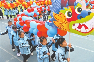 近日,廣西南寧市民族大道東段小學(xué)學(xué)生在體育節(jié)開幕式上享受舞龍的快樂。在體育節(jié)開幕式活動上,孩子們以舞龍、武術(shù)、舞蹈等方式,盡情享受運(yùn)動的快樂。
