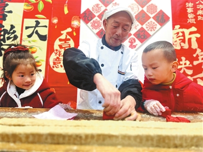 “拜年不帶麻酥糖,請君不要進廳堂……”在春節(jié)即將到來之際,安徽省黃山市歙縣王村鎮(zhèn)中心幼兒園的孩子們哼唱著歌謠,在老手藝人的指導下,制作當?shù)氐姆俏镔|(zhì)文化遺產(chǎn)——頂市酥。本報記者 王志鵬 通訊員 黃婷 攝