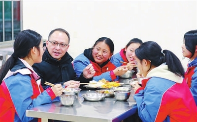 來自四川省成都市樹德中學(xué)的幫扶教師許國華在陪餐時與丹巴高級中學(xué)學(xué)生親切交談。