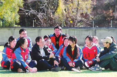 冬日暖陽下,來自四川省成都市第四十九中學(xué)校的政治教師彭建中(左四)和來自四川省資中縣第三中學(xué)的地理教師孫東斌(右一)與丹巴高級中學(xué)學(xué)生交流。