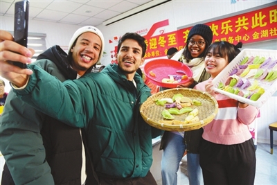 圖⑩ 在江蘇省鎮(zhèn)江市金湖社區(qū),江蘇大學(xué)的外國留學(xué)生與包好的餃子自拍“合影”。 石玉成 攝