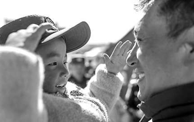 在定日縣長所鄉(xiāng)嘎布村,一個孩子戴上警察米瑪次仁的帽子敬禮(1月14日攝)。