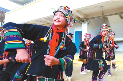 云霧繚繞處盡是郁郁蔥蔥,鳥鳴蟲叫中涌動著無限生機,云南省西雙版納傣族自治州景洪市基諾鄉(xiāng)中心小學如世外桃源一般靜立在原始森林的邊緣。課后興趣小組活動開始后,整個校園生動起來,音樂興趣班上,孩子們歡快地打擊起“奇科”“布姑”,美妙的音色和旋律在山川間汩汩流淌。