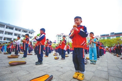 景洪市勐罕鎮(zhèn)中心小學學生在大課間進行葫蘆絲演奏。