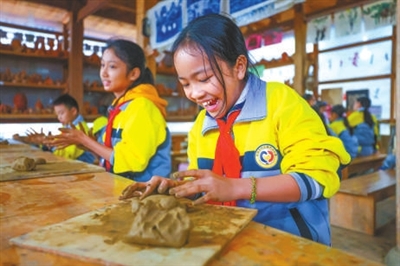 景洪市勐龍鎮(zhèn)中心小學(xué)非遺文化園里,學(xué)生正興致勃勃地進(jìn)行泥塑創(chuàng)作。
