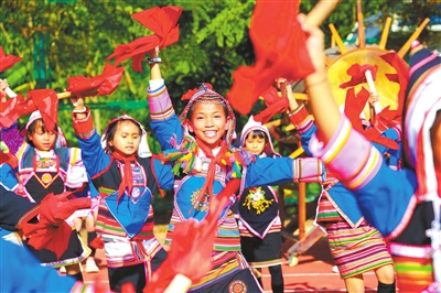 云南省西雙版納傣族自治州景洪市基諾鄉(xiāng)中心小學(xué)學(xué)生在進(jìn)行國(guó)家級(jí)非物質(zhì)文化遺產(chǎn)基諾大鼓舞的表演。