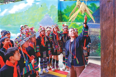 景洪市勐龍鎮(zhèn)中心小學(xué)勐宋完小教師李冬梅帶領(lǐng)四年級(jí)學(xué)生來(lái)到寨門(mén),實(shí)地講解哈尼族寨門(mén)飾物包含的寓意。