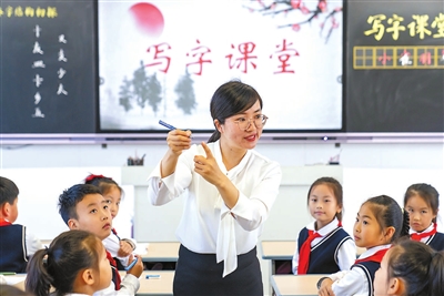 江蘇省南通市海安高新區(qū)實驗小學(xué)的教師在寫字課堂上給學(xué)生們講解正確書寫知識。
