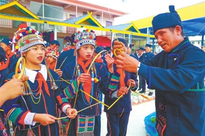 在長期的實踐摸索和專家的指導(dǎo)下,學(xué)校決定從增強學(xué)生對傳統(tǒng)文化的認(rèn)同上打開突破口。教師們一起去找寨子里傳承手工藝的老人聊天、學(xué)習(xí),盡可能地把傳統(tǒng)習(xí)俗和文化融入音樂、美術(shù)、體育教學(xué)?!昂⒆觽冋J(rèn)識到了傳統(tǒng)文化的優(yōu)勢和價值,自信心就起來了?!崩疃氛f。