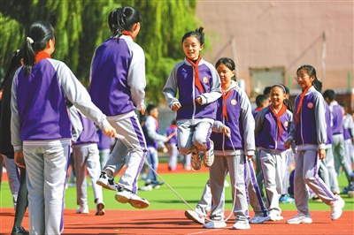 ①青島虎山路小學(xué)學(xué)生在課間15分鐘跳繩。張鷹 攝