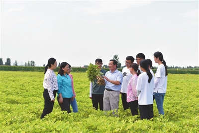 ③國家科技進步獎二等獎獲得者、山東農(nóng)業(yè)大學(xué)花生育種專家萬勇善教授在田間與團隊成員查看花生新品種生長狀況。學(xué)校供圖