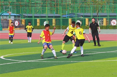③山西省忻州市和平小學(xué)學(xué)生在操場上踢足球。學(xué)校供圖