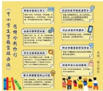 《辦法》做了六個(gè)方面的修訂。一是明確了學(xué)籍、學(xué)籍信息、學(xué)籍管理、學(xué)籍檔案的定義,對(duì)學(xué)籍信息、學(xué)籍管理、學(xué)籍檔案明確地作出了類(lèi)型劃分。二是進(jìn)一步明確了國(guó)家、省、市、縣、校各級(jí)學(xué)籍管理部門(mén)的權(quán)力、職責(zé),對(duì)學(xué)籍管理權(quán)進(jìn)行合理調(diào)整,賦予地方學(xué)籍管理部門(mén)相應(yīng)的自主管理權(quán)。三是優(yōu)化信息系統(tǒng)架構(gòu),明確國(guó)家學(xué)籍系統(tǒng)采用一級(jí)部署、五級(jí)應(yīng)用模式,并對(duì)國(guó)家學(xué)籍系統(tǒng)與地方學(xué)籍系統(tǒng)職能進(jìn)行了合理定位與區(qū)分。四是解決學(xué)籍管理突出問(wèn)題,突出了教育公平,對(duì)跨省轉(zhuǎn)學(xué)、省內(nèi)轉(zhuǎn)學(xué)等學(xué)籍變動(dòng)條件進(jìn)一步作了細(xì)化規(guī)范。五是回應(yīng)特殊學(xué)籍管理需求,對(duì)特殊教育學(xué)生、專(zhuān)門(mén)學(xué)校學(xué)生、境外學(xué)生、高中階段職普融通項(xiàng)目學(xué)生等類(lèi)型的學(xué)籍管理作出規(guī)定,為推進(jìn)基礎(chǔ)教育相關(guān)改革提供支撐。六是優(yōu)化學(xué)籍應(yīng)用服務(wù)和人文關(guān)懷,對(duì)學(xué)生教育數(shù)字身份、學(xué)籍管理移動(dòng)端建設(shè)、減證便民等作出明確規(guī)定。