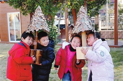 近日,浙江省諸暨市暨南街道街亭幼兒園的孩子們,利用落葉、硬卡紙、固體膠、棍子等材料制作了一棵棵富有大自然氣息的“小樹”。通過活動,孩子們不僅學(xué)會了合理利用廢舊物品,更鍛煉了動手能力。圖為孩子們把用落葉做成的“小樹”當(dāng)“雨傘”玩。 陳霞芳 攝