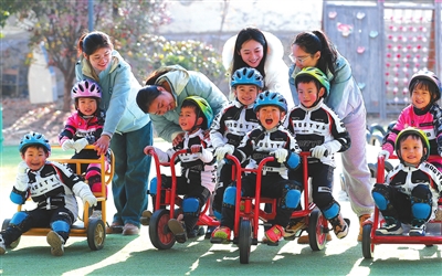 在江蘇省徐州市鼓樓區(qū)萬(wàn)科城幼兒園,徐州幼兒師范高等專(zhuān)科學(xué)校體育學(xué)院學(xué)生帶領(lǐng)小朋友開(kāi)展騎行游戲。