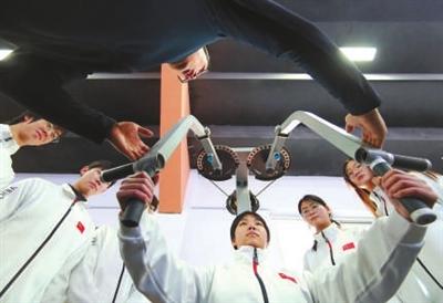 在徐州幼兒師范高等專(zhuān)科學(xué)校體育學(xué)院健身房,體院教師指導(dǎo)學(xué)生開(kāi)展健身教學(xué)。