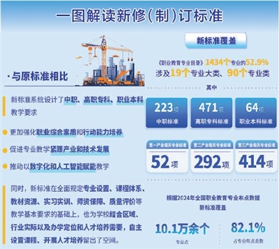 新標(biāo)準(zhǔn)覆蓋《職業(yè)教育專業(yè)目錄》1434個專業(yè)的52.9%,涉及19個專業(yè)大類、90個專業(yè)類。其中,中職標(biāo)準(zhǔn)223項,高職??茦?biāo)準(zhǔn)471項,職業(yè)本科標(biāo)準(zhǔn)64項;第一產(chǎn)業(yè)相關(guān)專業(yè)標(biāo)準(zhǔn)52項,第二產(chǎn)業(yè)相關(guān)專業(yè)標(biāo)準(zhǔn)292項,第三產(chǎn)業(yè)相關(guān)專業(yè)標(biāo)準(zhǔn)414項。根據(jù)2024年全國職業(yè)教育專業(yè)布點(diǎn)數(shù)據(jù),新標(biāo)準(zhǔn)覆蓋10.1萬余個專業(yè)點(diǎn),占專業(yè)布點(diǎn)總數(shù)的82.1%。