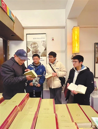 在書店,教師與學(xué)生交流。