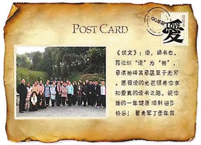 從2014年寒假我?guī)е?5個(gè)學(xué)生第一次到先鋒書店購(gòu)書讀書開始,到后來(lái)參加人員從經(jīng)典夜讀小組學(xué)生擴(kuò)展到啟明星讀書社骨干,人數(shù)越來(lái)越多,轟轟烈烈,成了我們的讀書節(jié)日,一晃到今年已經(jīng)走過(guò)了11年。我喜歡把自己與學(xué)生在先鋒書店門口的合影做成電子賀卡,在大年初一發(fā)給學(xué)生。2014年的賀卡,我寫下了這樣一段話,表達(dá)我對(duì)學(xué)生的祝福:“愿愛知求真的燃燈者精神,傳遞開來(lái),傳遞下去,照亮所有的人!祝大家快樂進(jìn)步!——你們的老曹?!倍?017年的賀卡,我寫下另一段話,表達(dá)對(duì)學(xué)生的鼓勵(lì):“《說(shuō)文》:讀,誦書也。段注訓(xùn)‘讀’為‘抽’,意謂抽繹其意蘊(yùn)至于無(wú)窮。愿夜讀的光芒照亮你求知愛真的讀書之路。祝你新的一年健康、順利、進(jìn)步、快樂!曹勇軍丁酉年賀?!?
