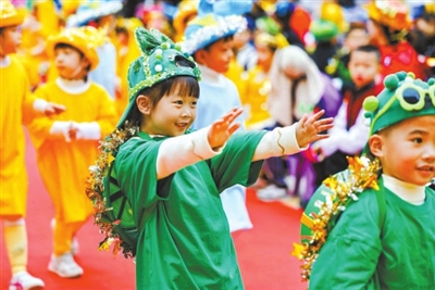 日前,福建省晉江市藝樹實驗幼兒園舉辦了第六屆“戲劇節(jié)”。從主題LOGO設(shè)計到親子角色秀,幼兒園處處是舞臺,孩子們個個是主角。教師、家長全程參與,共同享受著戲劇帶來的樂趣,生成了158個原創(chuàng)班本劇,為戲劇節(jié)增添了豐富的色彩與無限的活力。圖為孩子們參與戲劇表演。蔡彩萍 文 林慧婷 攝