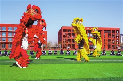 山東省淄博科技學校學生在進行迎開學舞獅演練。 張維堂 馬東惠 攝