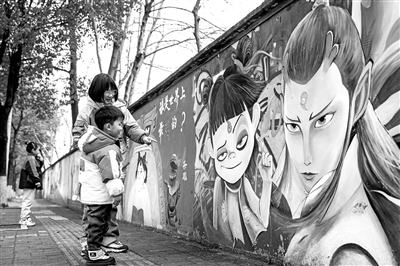 2月23日,小朋友在湖南省長沙市岳麓區(qū)岳麓街道五星村觀看哪吒主題墻繪。