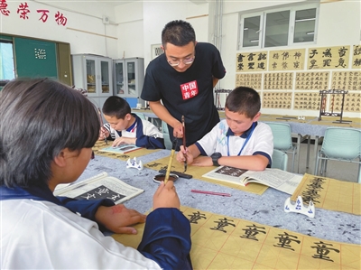 ③新疆生產(chǎn)建設(shè)兵團(tuán)第三師五十一團(tuán)第一中學(xué)的書法教師在指導(dǎo)學(xué)生學(xué)書法。蔣夫爾 攝