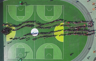 2月26日,河北省石家莊市草場街小學學生在觀賞龍頭蜈蚣風箏(無人機照片)?!岸露迸R近,當?shù)刂行W邀請風箏制作民間藝人作為校外輔導員,介紹風箏文化和制作技藝,讓學生感受傳統(tǒng)文化魅力。 新華社發(fā)
