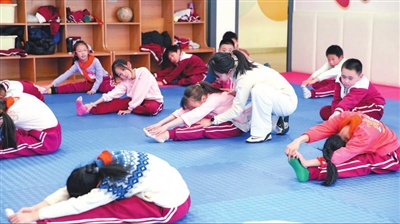 ②李照藝在北大附中西三旗學(xué)校小學(xué)跆拳道專(zhuān)項(xiàng)課上進(jìn)行柔韌練習(xí)指導(dǎo)。