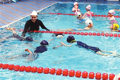 ①梅麗小學(xué)游泳課上,陳詩銘組織學(xué)生進行漂浮自救練習。