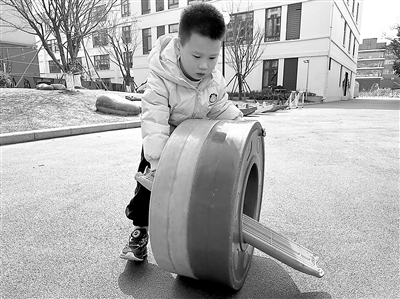 糖豆嘗試用一塊平衡板推動大圓輪。周亞芳 攝